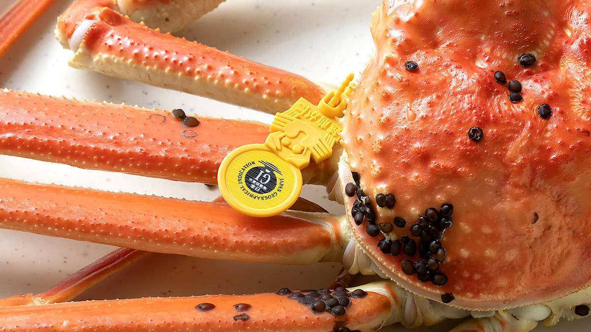 この黄色いタグは、福井県内の港で水揚げされた本物の越前蟹であることを示す「産地の証明」です。